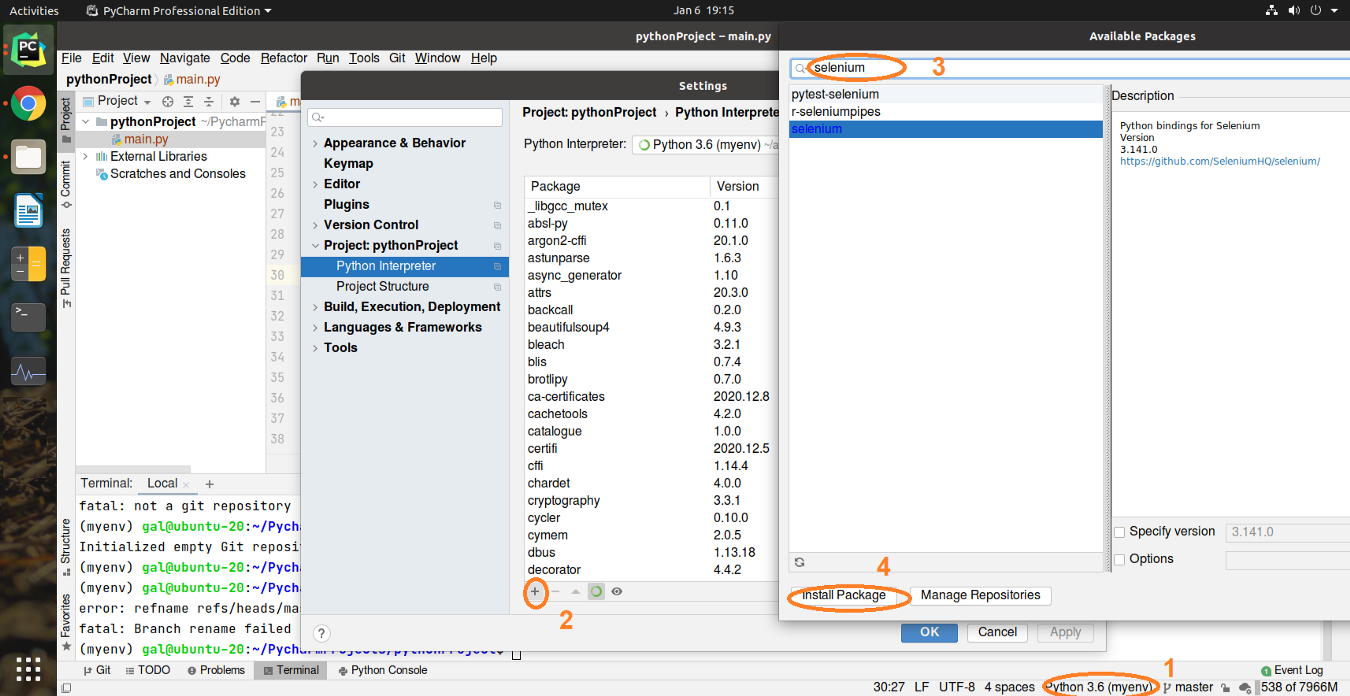 Selenium documentation offers to install packages in several different ways. In my case, I apply installation on virtual environments in Pycharm for Ubuntu OS.